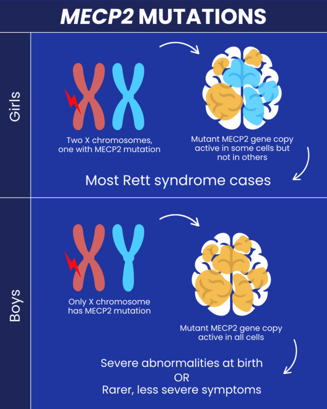 Rett syndrome mainly affects girls because the MECP2 gene is located on the X chromosome, which is one of the two sex-determining chromosomes. Although there are exceptions, generally biological females have two X chromosomes while biological males have one X and one Y. This means that most girls get two copies of the MECP2 gene, while most boys get only one.