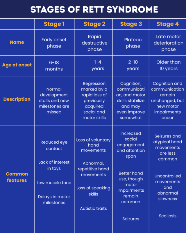 While Rett syndrome progression typically happens in this way, it is important to note that these stages do not universally apply to every person with Rett. However, they are useful for understanding how Rett syndrome is likely to evolve over time, providing guidance for planning for future life stages.