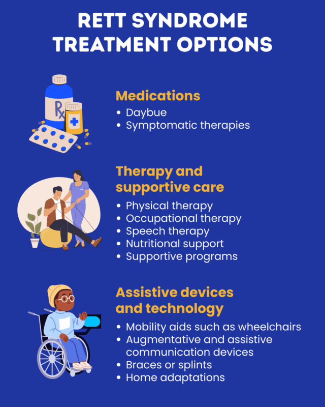 Apart from Daybue, a wide range of medications may be used to manage Rett symptoms. Generally, this involves medications that are approved to help relieve specific issues in the general population. Rett syndrome symptom management may include treatments to: